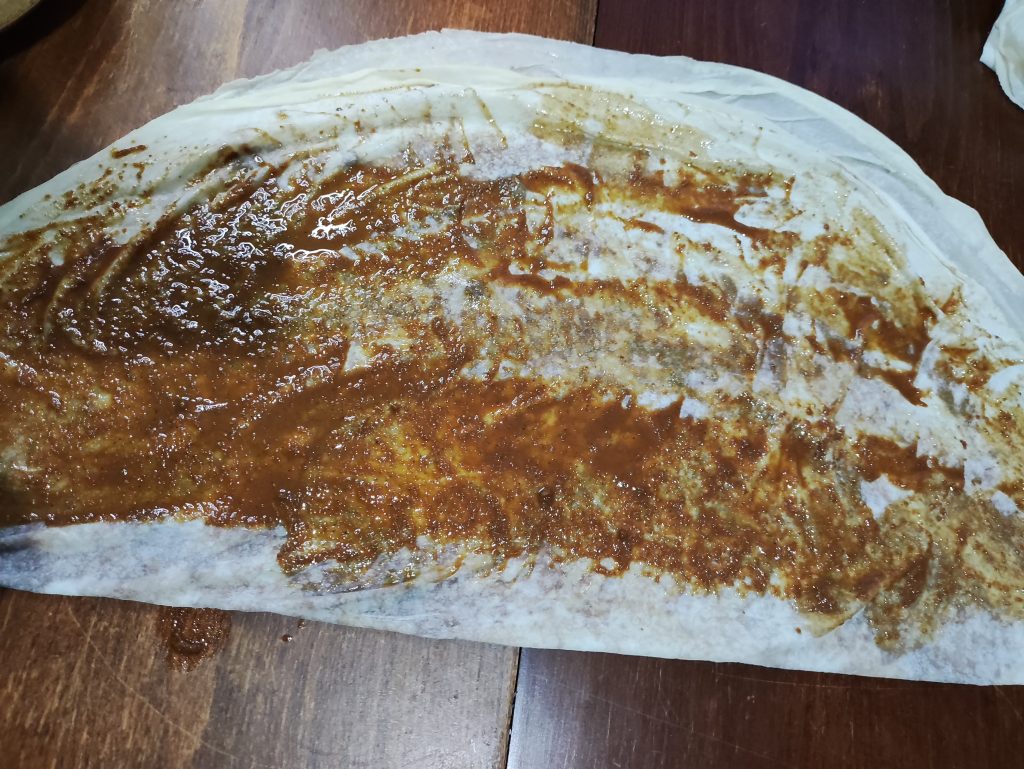 - Yufkayı düz bir yere serip üzerine haşhaşlı sostan sürüp yufkayı ikiye katlayınız (yarım ay şekli)