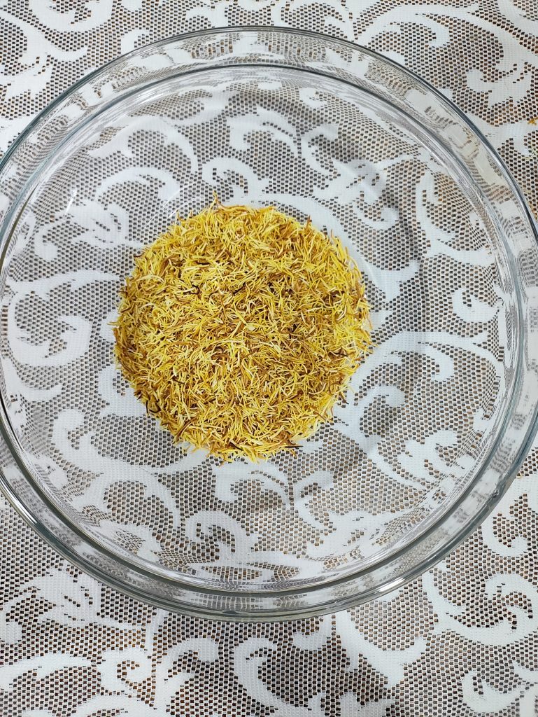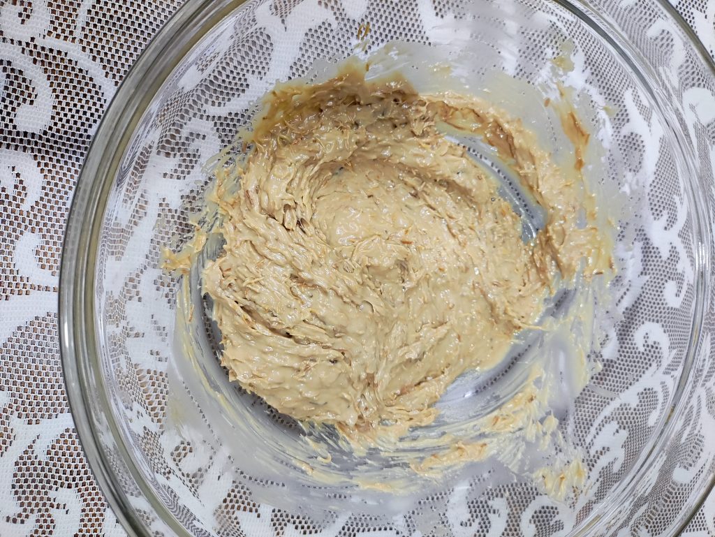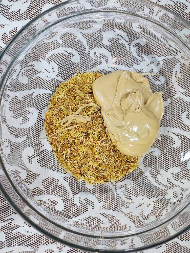 - İç dolgusu için fıstık ezmesini bir kaseye koyup üzerine hazır kadayıfı ekleyip karıştıralım.