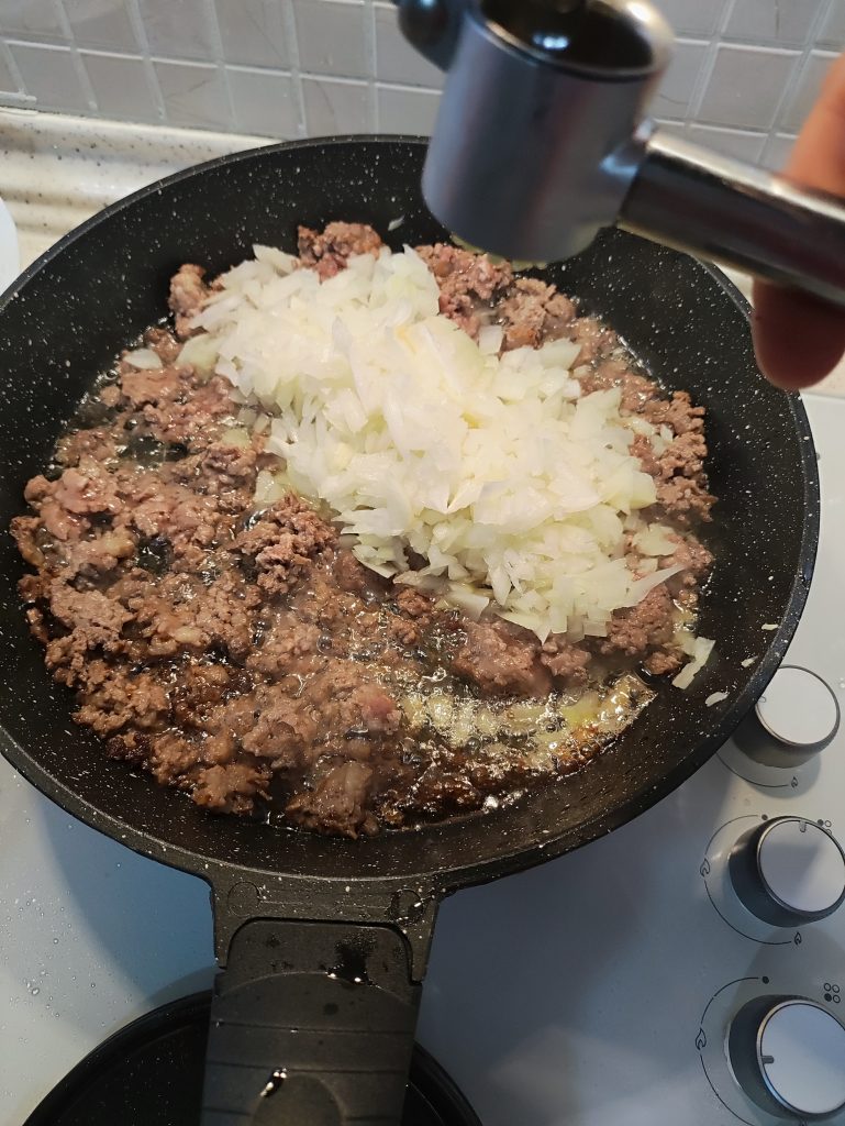 - soğanlar rengini değiştirmeye başladıktan sonra kıymayı koyup kavurunuz.