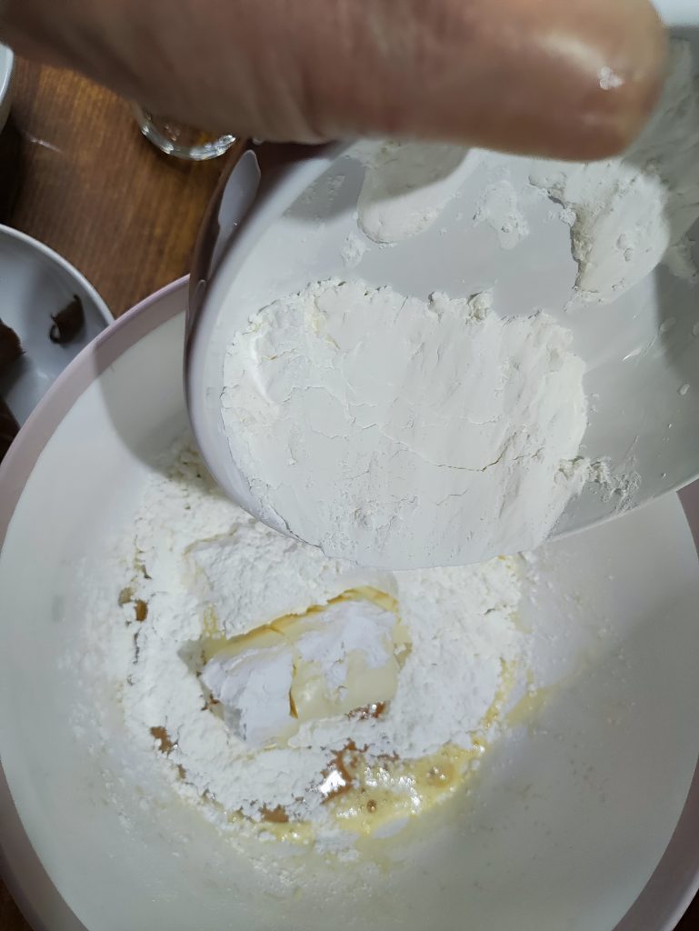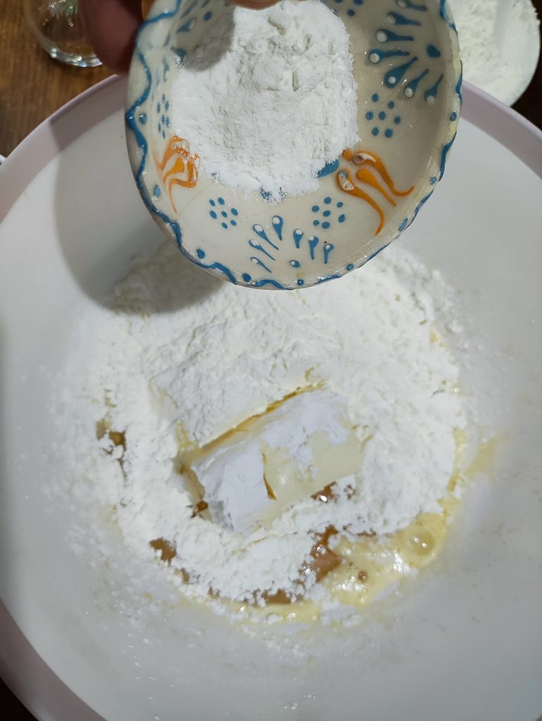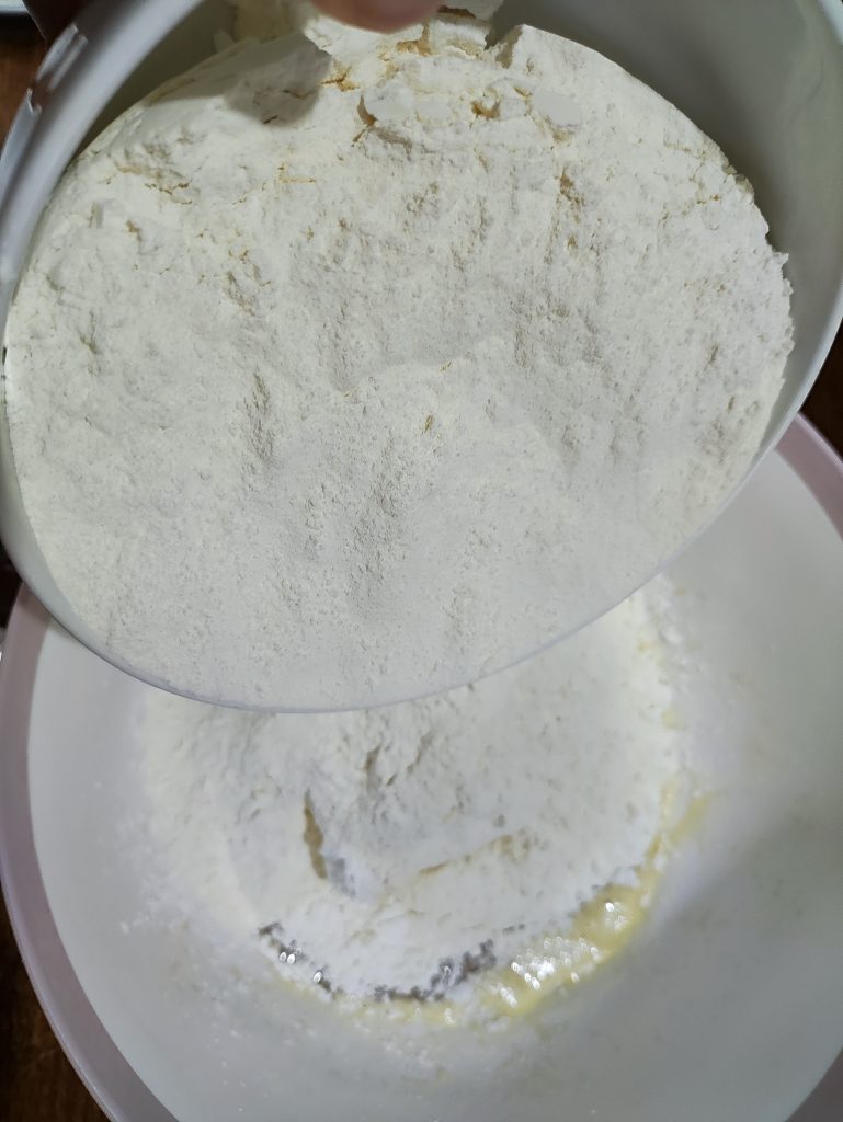 3. Üzerine kabartma tozu ve unu yavaş yavaş karışıma eleyerek ele yapışmayan pürüzsüz bir hamur elde edene kadar yoğurun.
