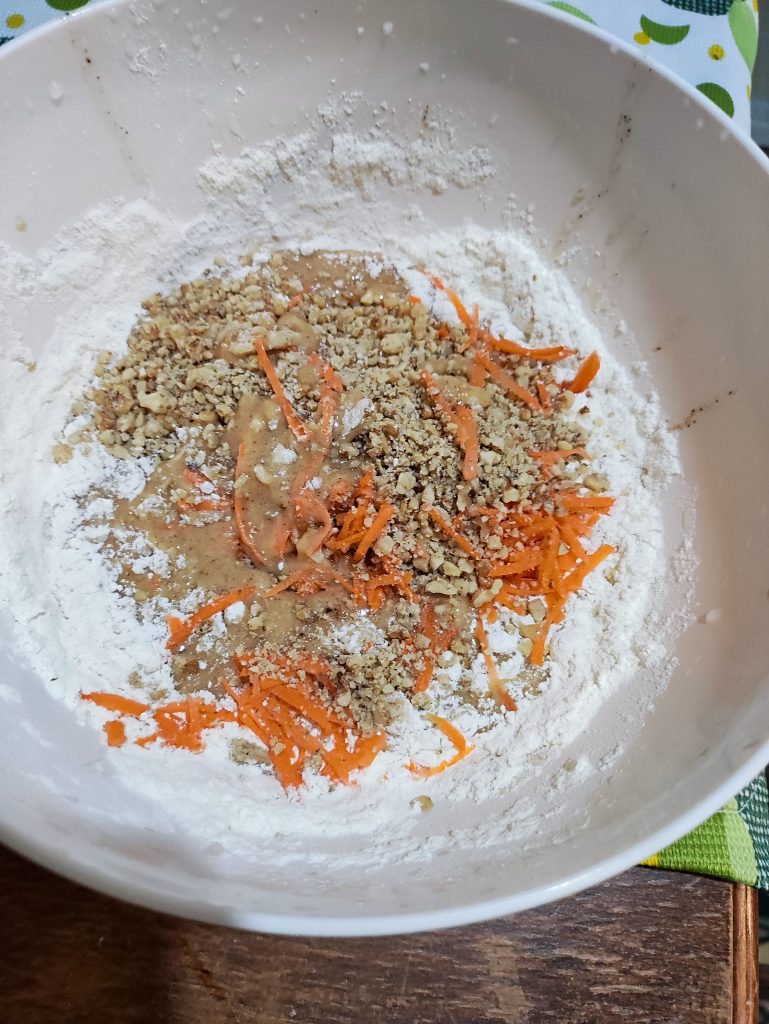 - Son olarak rendelemiş olduğunuz havuç ve ceviz ekleyin ve sadece malzemeler birleşene kadar karıştırın.