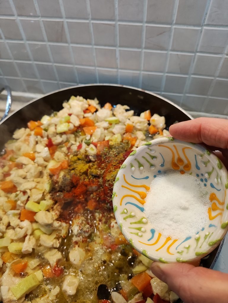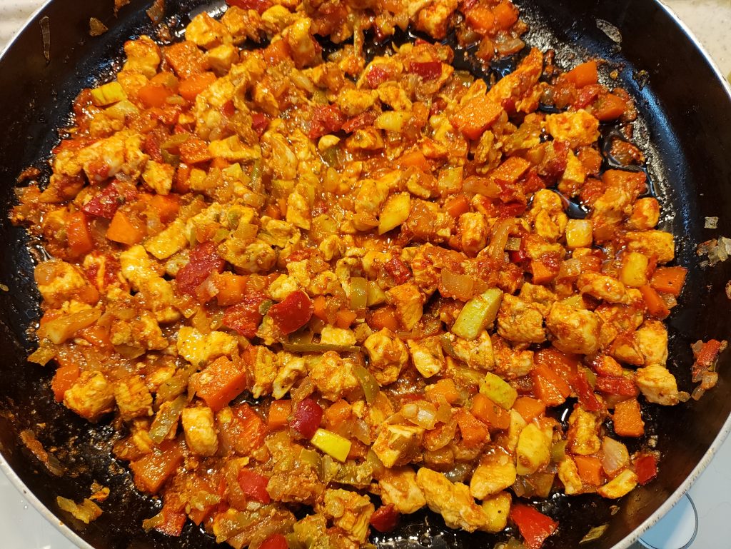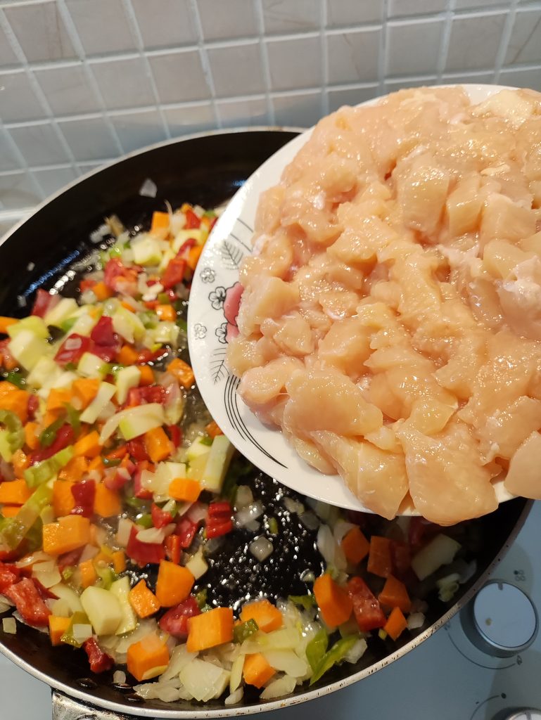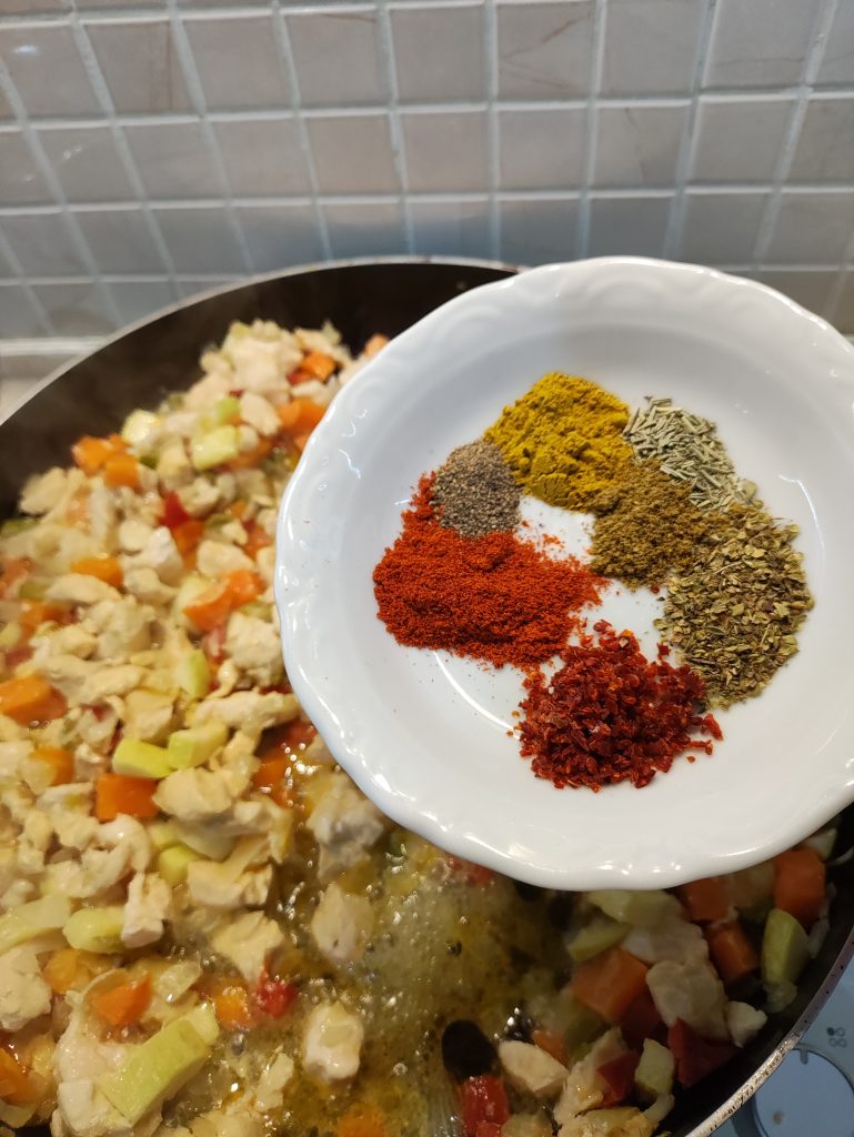 Tavuk etini koyup karıştırın. Tavuk eti pişmeye başlayınca baharatlarını ekleyip karıştırdıktan sonra karıştırıp, kısık ateşte pişiriniz.